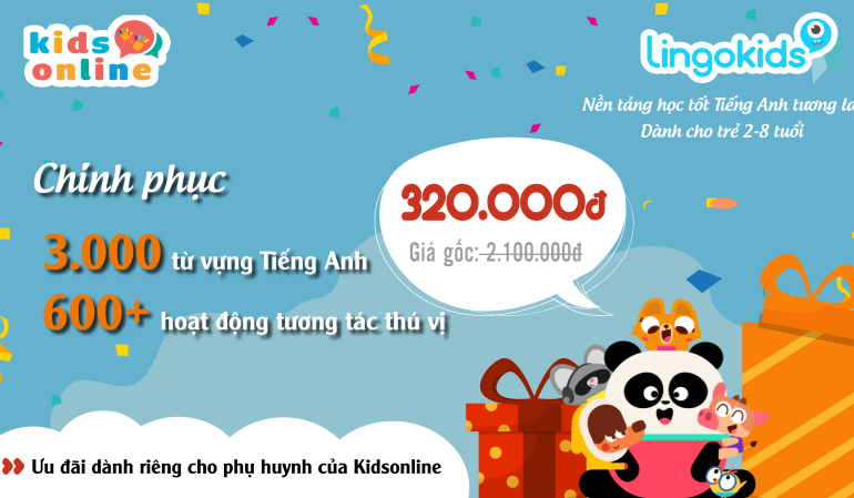 [Độc quyền trên KidsOnline] Tặng ngay 1.780.000đ cho các bé được bố mẹ lấy mã chương trình quà tặng Lingokids. Giá niêm yết khi đăng ký tài khoản học tiếng anh Lingokids: $90/năm (tương đương 2.100.000vnđ) KidsOnline trợ giá cho các