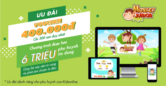 [Ưu đãi độc quyền dành riêng cho khách hàng của KidsOnline] Quà tặng chương trình Tri ân khách hàng –KidsOnline trợ giá mua tài khoản học ngôn ngữ Monkey Junior cho con, mỗi phụ huynh được nhận 01 voucher 499.000vnđ khi