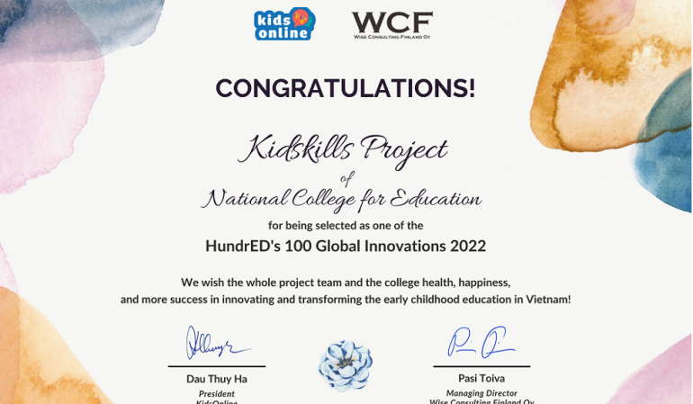 We are sending big congratulation to the National College of Education, Vietnam’s leading college for preschool teachers training, and the NCE Kidskills team, led by teacher Nguyen Thi Phuong, for becoming the 1st ever Vietnamese preschool education project selected to HundrEDorg